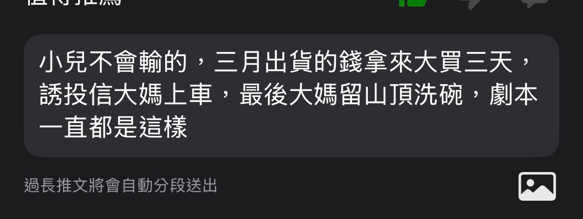 2026-04-10 11:44:10 噓 Pixma258: 糖漿: gg那麼好賺,我也想賺不行逆,只會賠錢時叫我進場 182F 04-10 15:03