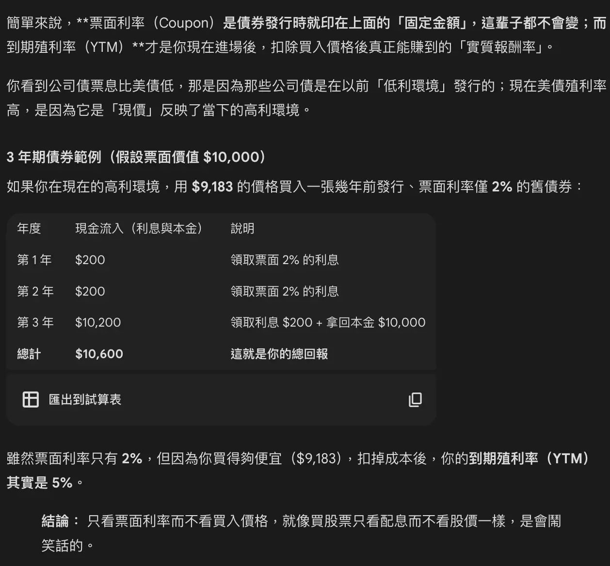 2026-02-15 13:27:20 噓 maplefff: 票面利率, 到期殖利率都搞不清楚. 你先問AI好不好票面1%, 現在市場利率5%, 你會用原價100買是不是? 58F 02-15 19:02